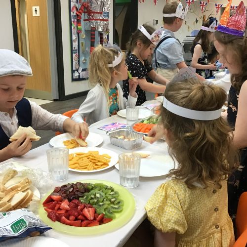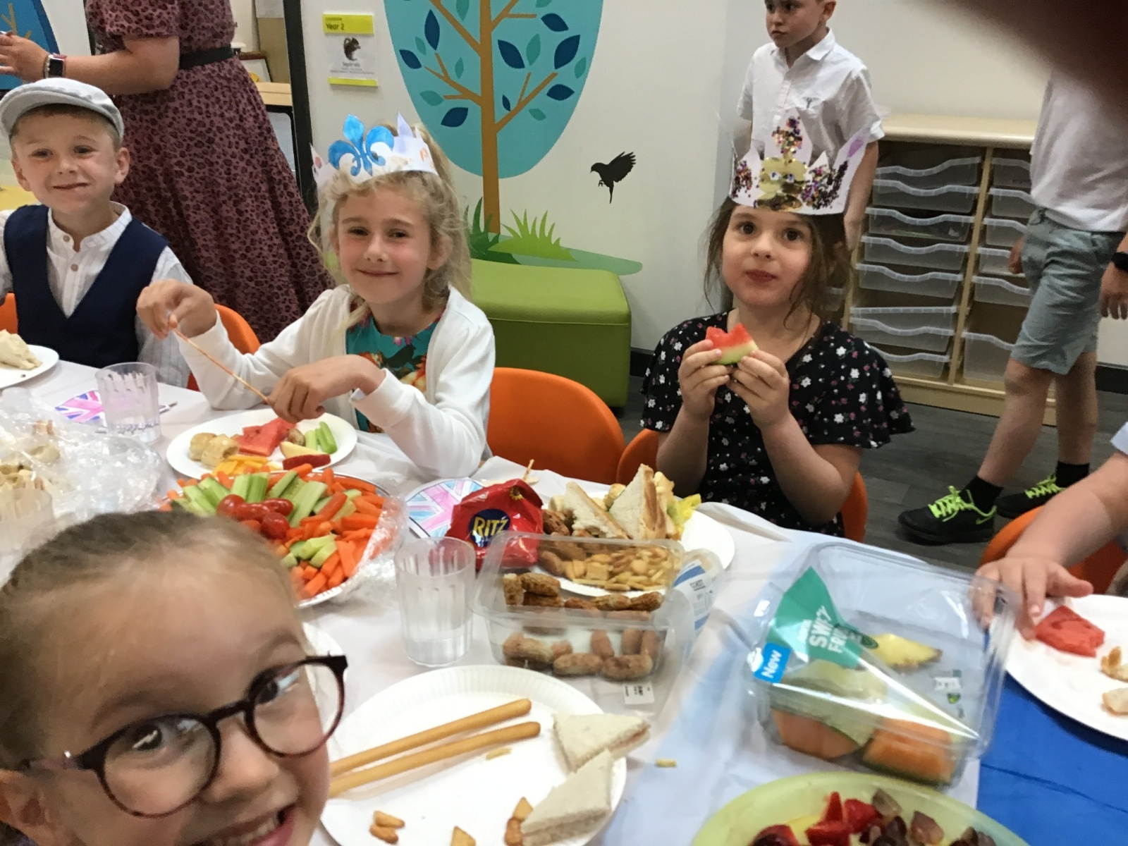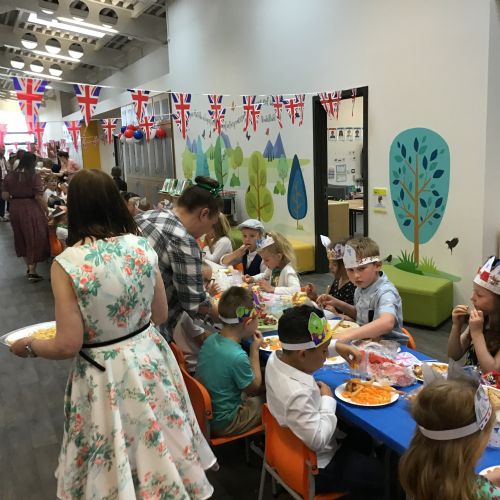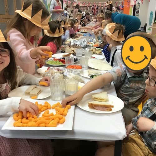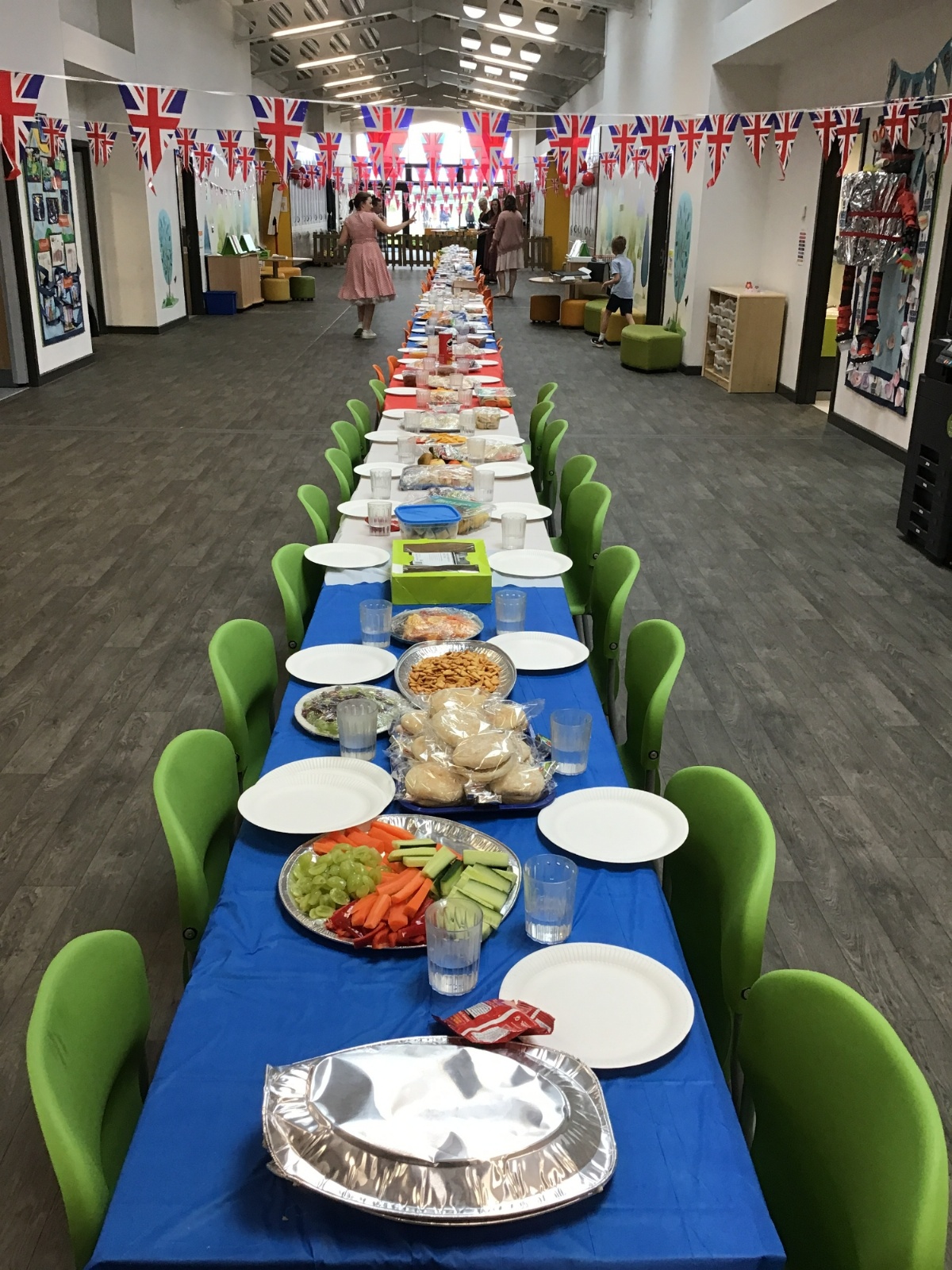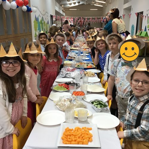 Later, Reception through to Year 3 celebrated in a traditional Jubilee Street Party at lunchtime. The staff and Year 3 worked hard to decorate and furnish the hallway with one long table with place settings for over 100 children! Union flag bunting was hung the length of the corridor and every piece of furniture was decorated with red, white and blue balloons.