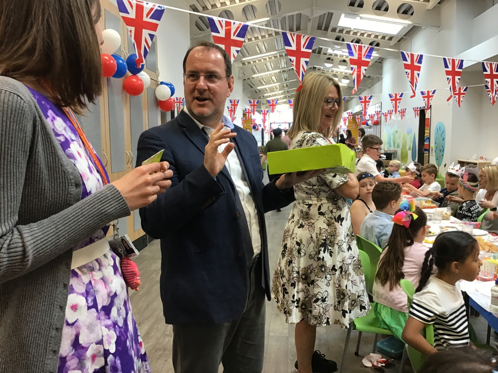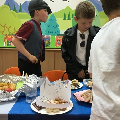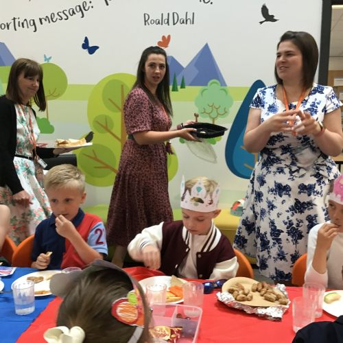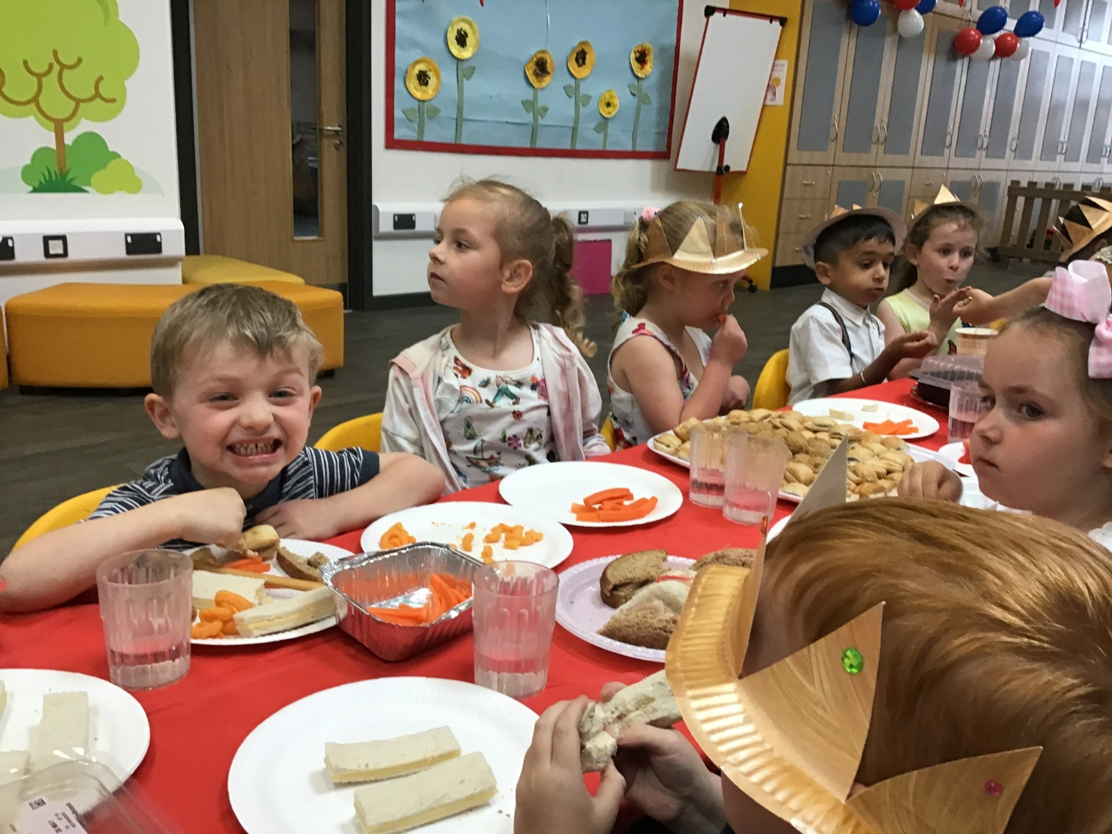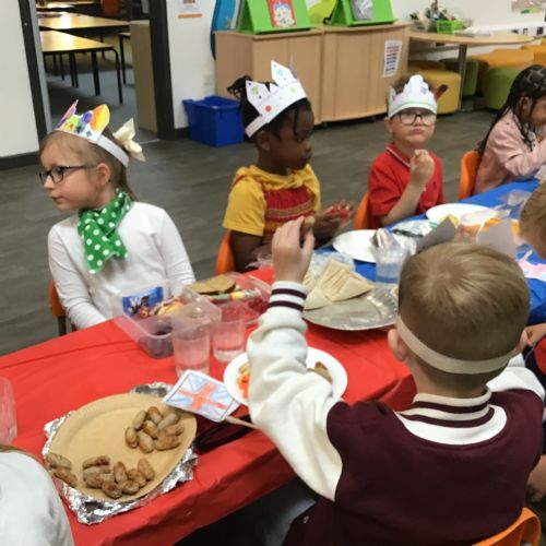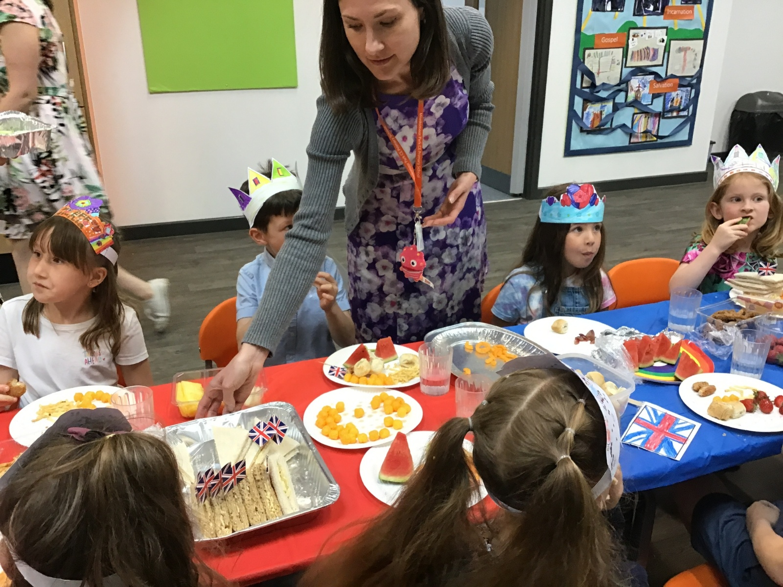 Later, Reception through to Year 3 celebrated in a traditional Jubilee Street Party at lunchtime. The staff and Year 3 worked hard to decorate and furnish the hallway with one long table with place settings for over 100 children! Union flag bunting was hung the length of the corridor and every piece of furniture was decorated with red, white and blue balloons.