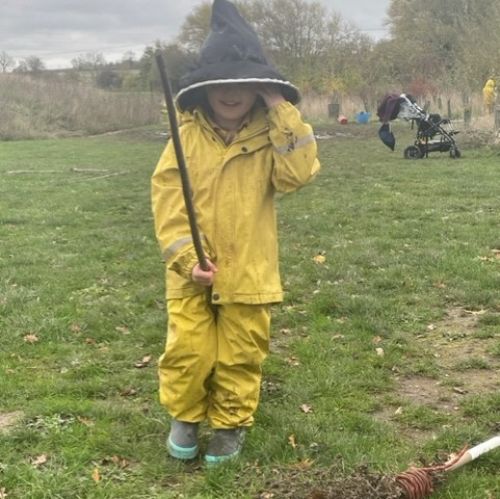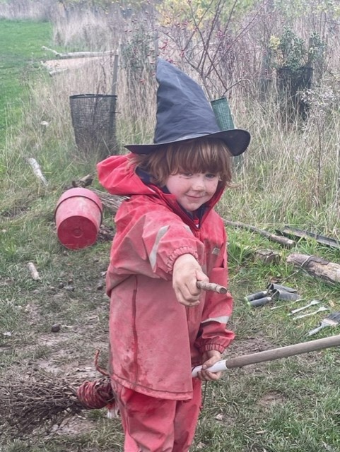 'Room on the Broom' was the theme at Forest School for the other Reception group this week although of course the huge puddle was very tempting and lots of fun! Some of the children really got into character and used lots of language from the story in their games. Some lovely autumn wands were made, and Mrs Ronnie was turned into all kinds of interesting things by the children's spells.