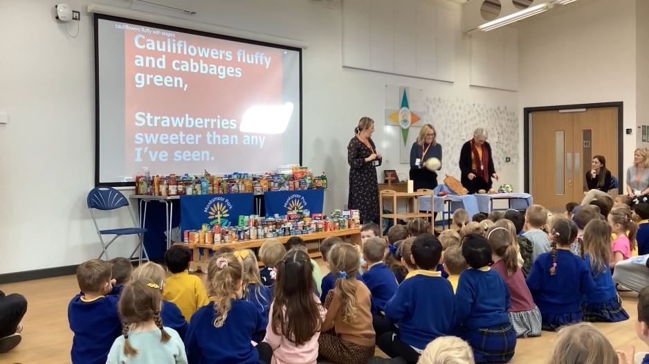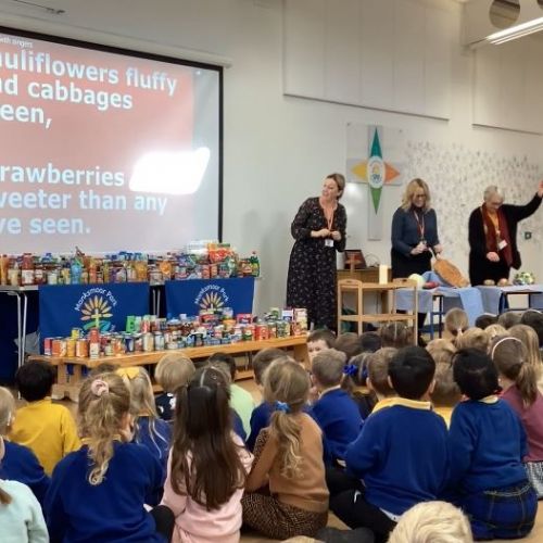 On Friday morning, we held our Harvest Festival Collective Worship for Nursery to Year 4. We discussed Harvest, the benefit our food donations will have for members of our community and sang a Harvest song we'd learned; however this morning we had props and actions to add.