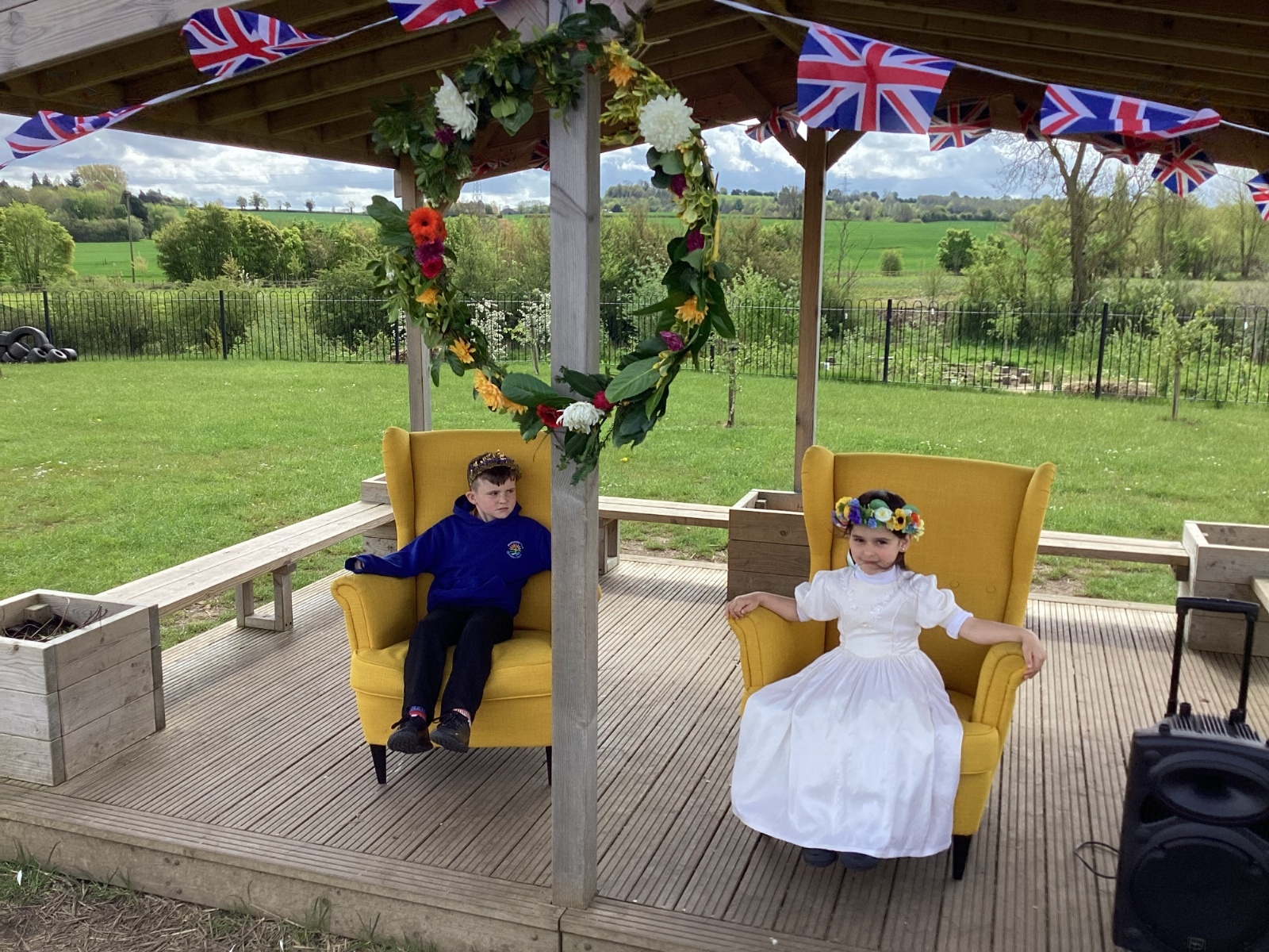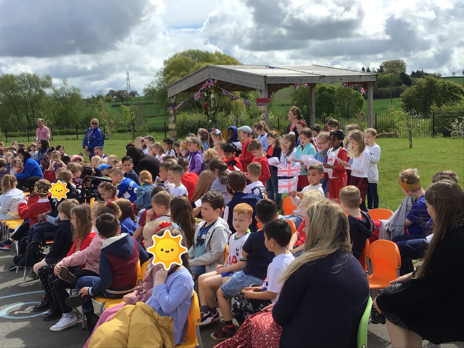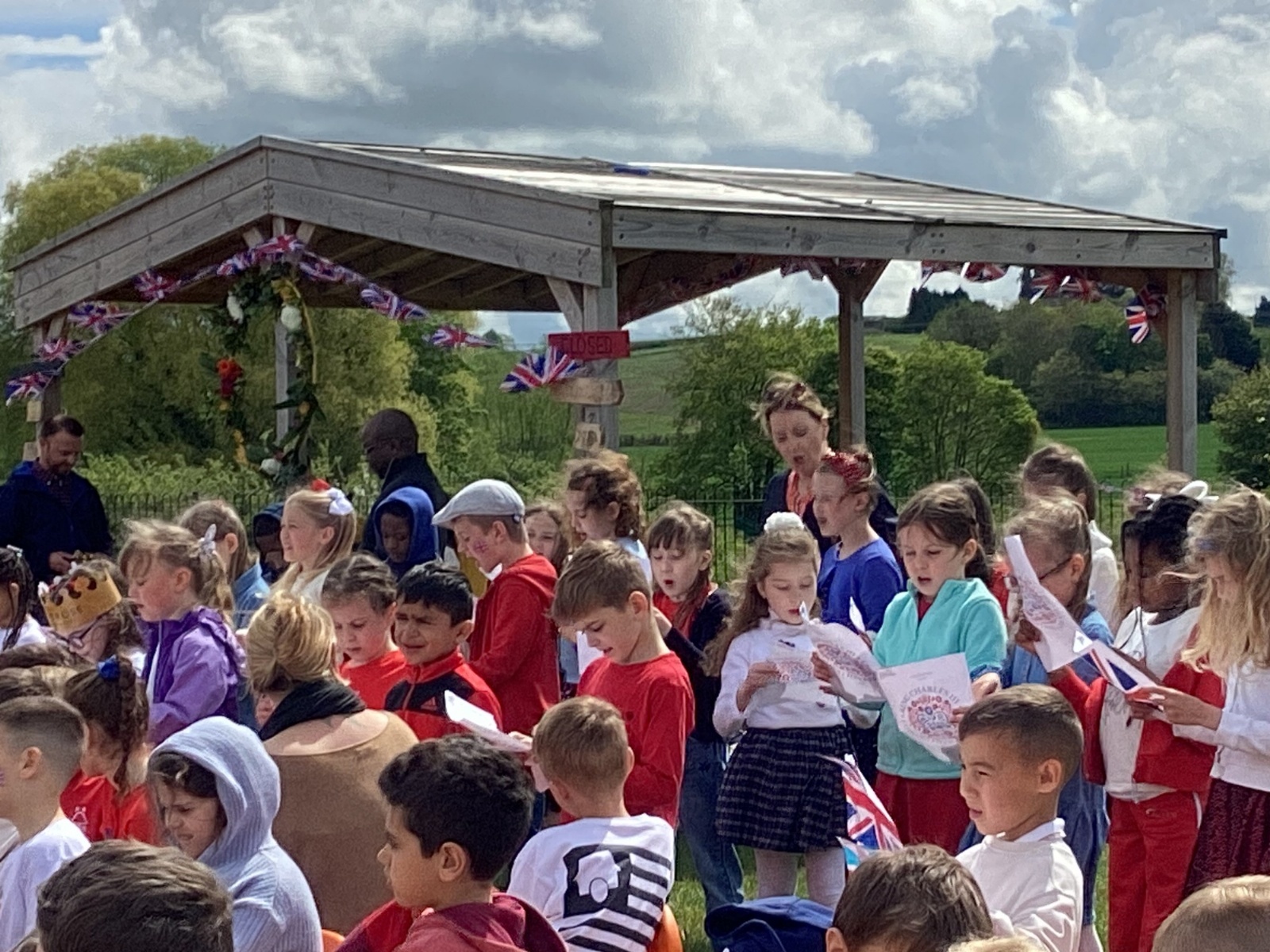After the Maypole dancing the choir helped close that section of our Celebration by leading the whole school in the Coronation Day song. We then gathered together in either class groups or with our families to enjoy a picnic. Sadly this didn't last very long as the rain clouds burst, and we were in a torrential downpour (for the second year in a row!). Especial thanks to the kind parents that helped those with younger children to take cover and helped to rescue furniture and equipment from the rain!