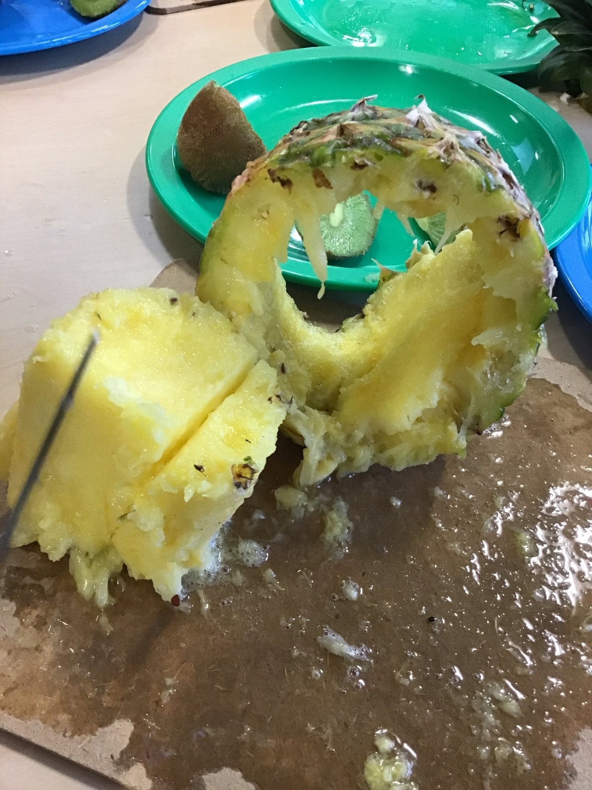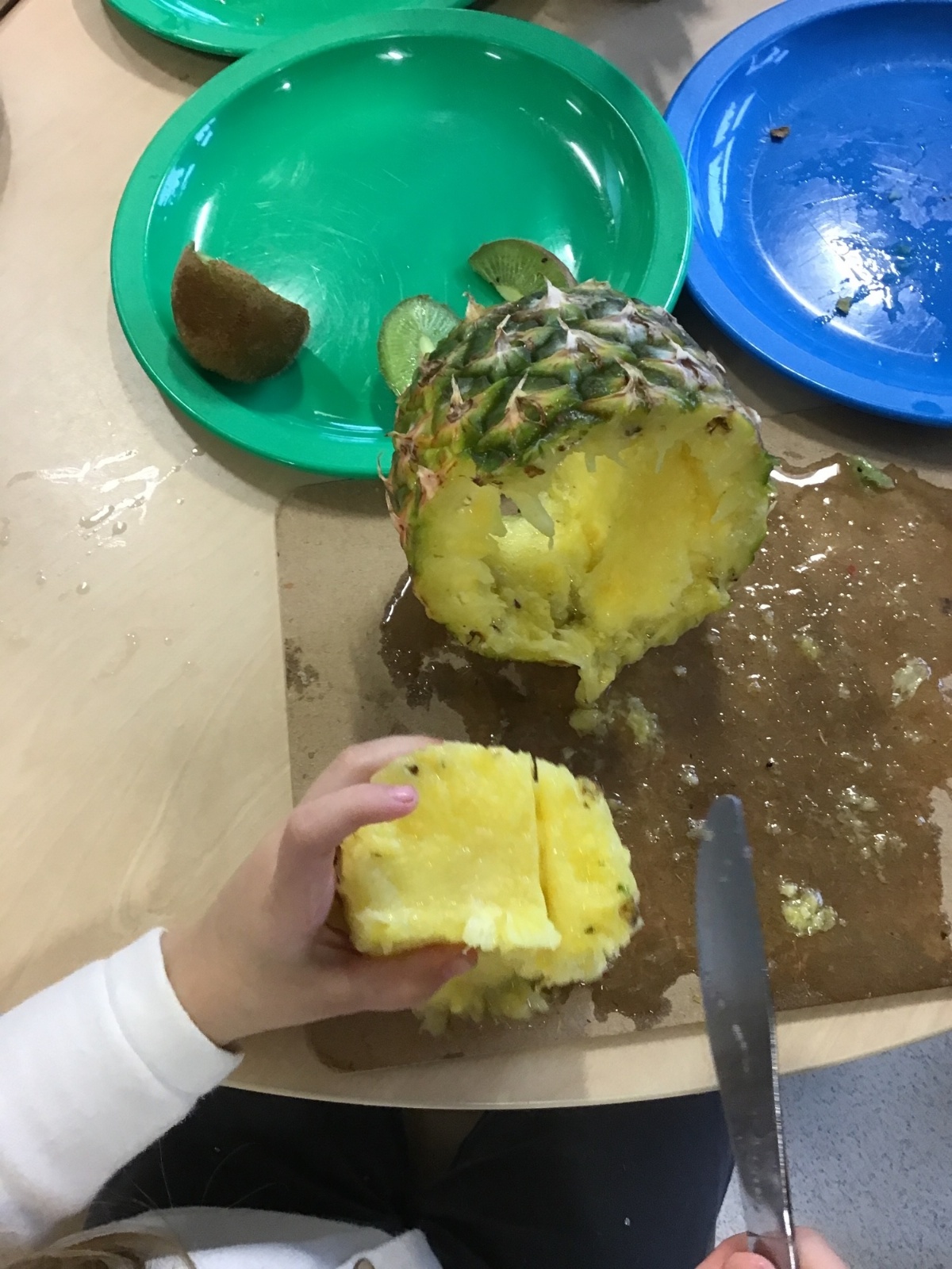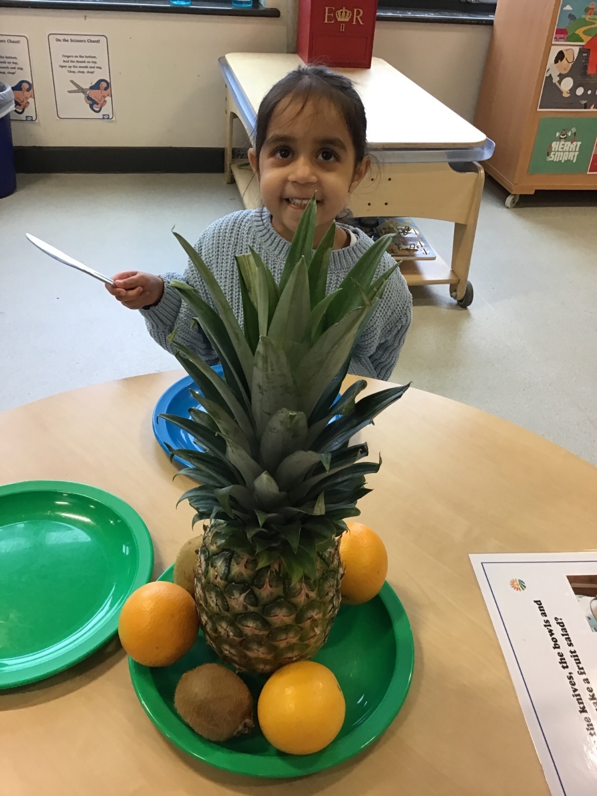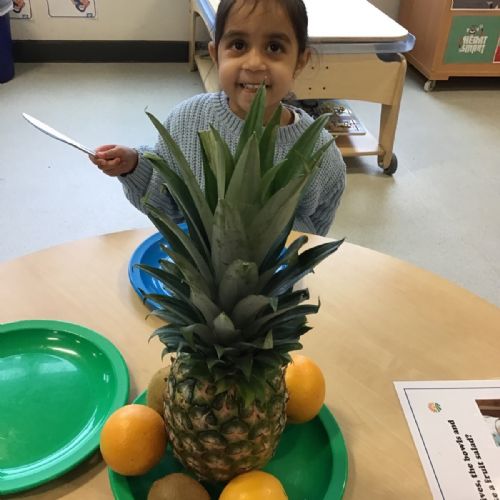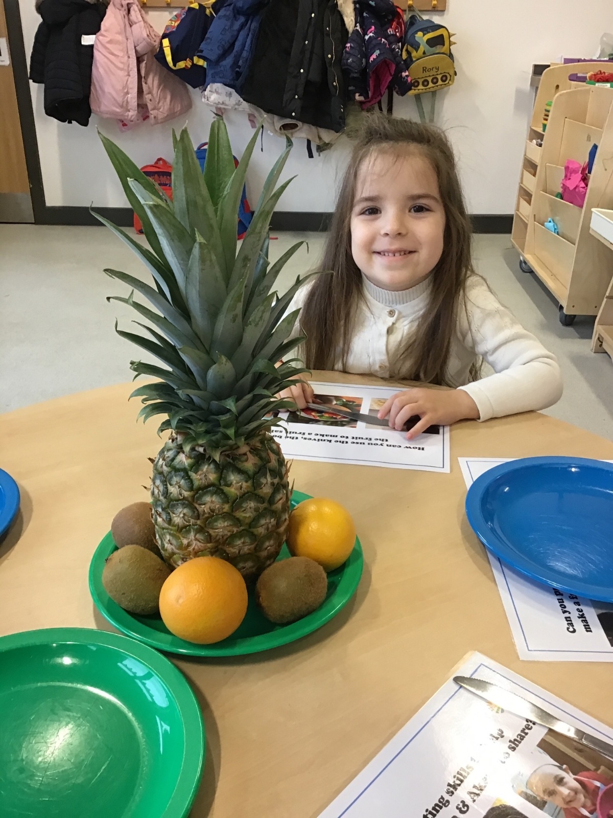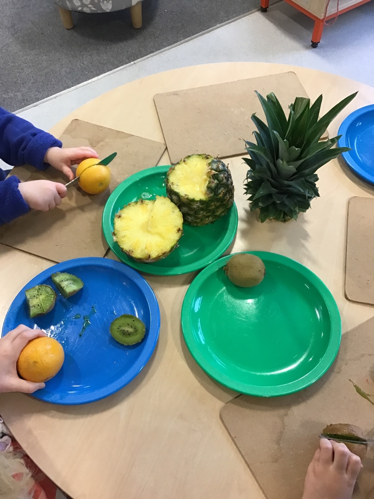 We have continued to practice following instructions this week and have used our cutting skills to enjoy a tasty and healthy fruit salad. We found that fruit is a lot messier to cut than vegetables. We developed our understanding of story structure by enjoying the tale of Handa's Surprise and learned the names of seven different fruits and seven different animals.