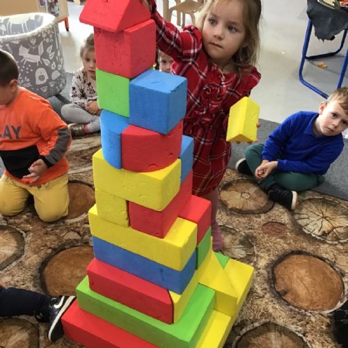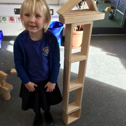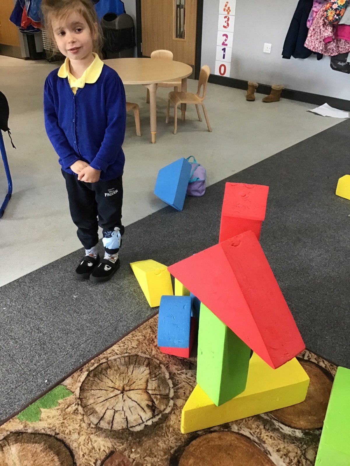 In Nursery, we have been enjoying the book 'Owl Babies' and have used puppets, painted pom-pom balls and word cards to help us retell the story. Our role-play area has become a builders' yard and we have had great fun making towers with our construction resources, taking great care to make sure our structures have a wide base to maintain their stability.