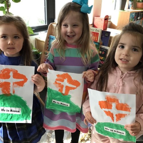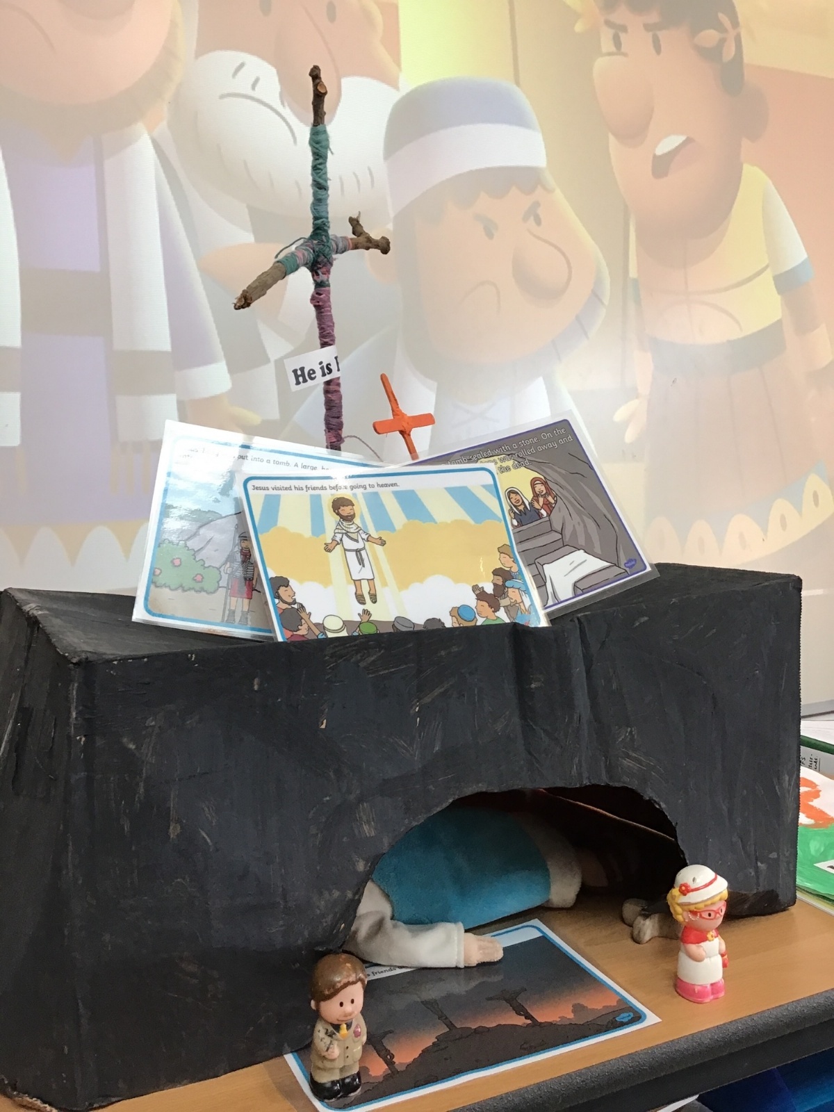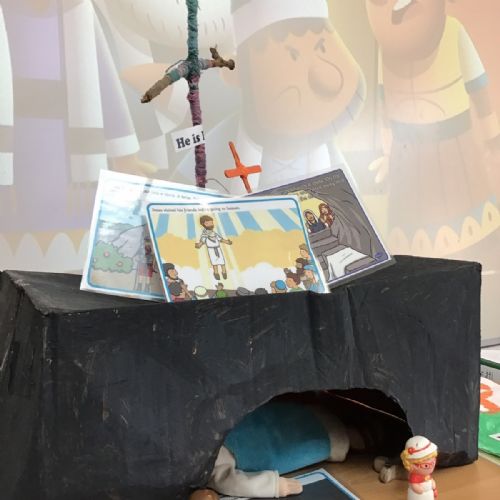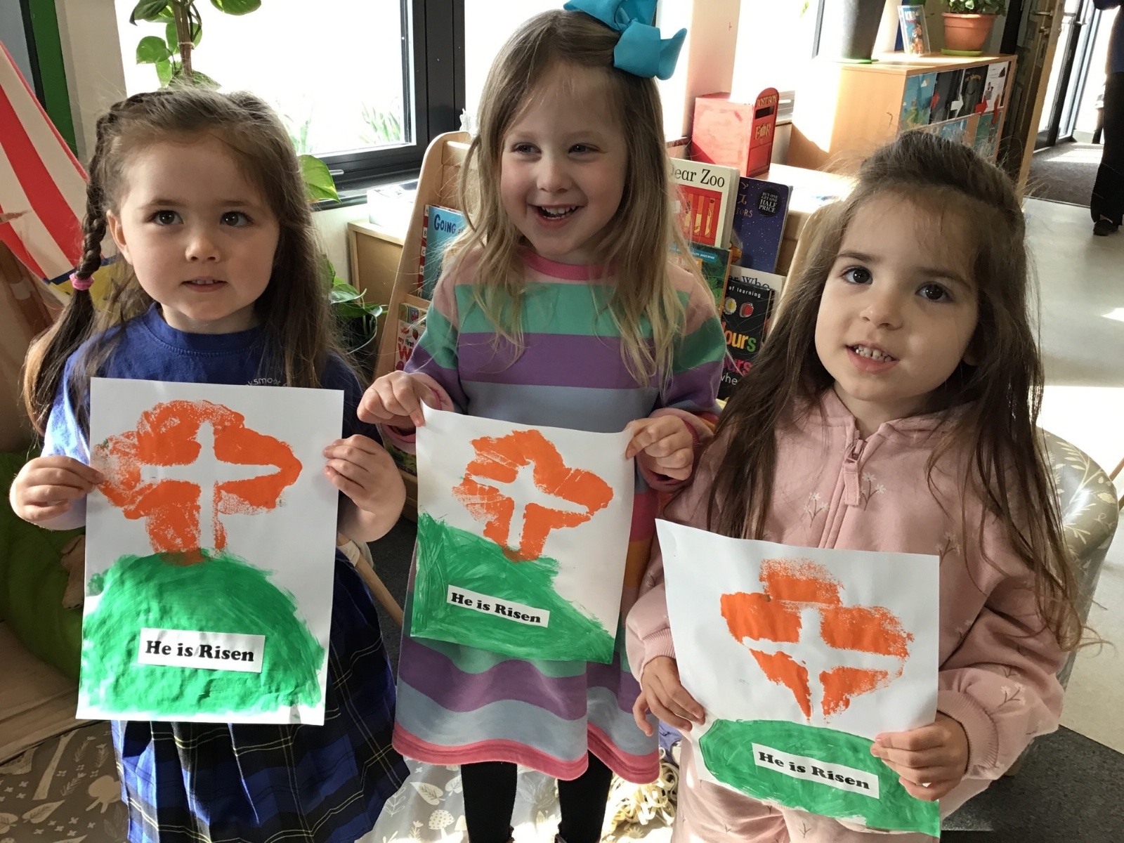 The Easter story has inspired some beautiful artwork in Nursery this week as the children have learned the key elements of Holy Week. They have also used the natural world to create some decorated wooden crosses, threading coloured wool using their fine motor skills and we have been making models of Jesus' tombs using junk modelling and Lego blocks.