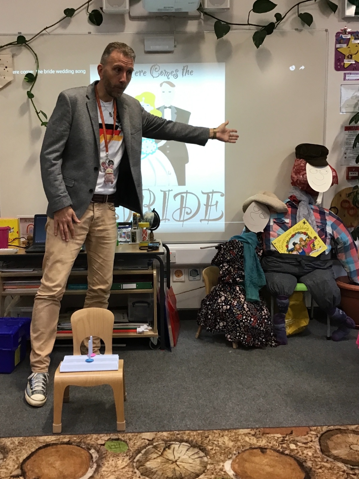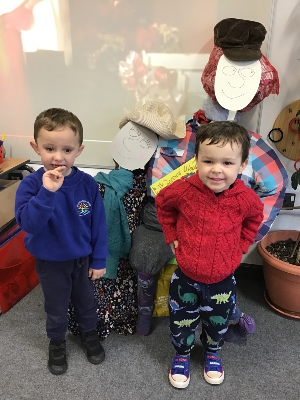 We have welcomed some scarecrows from home this week as the congregation has gathered for our Scarecrows' Wedding. The children have also been using the Word Are scheme to learn new vocabulary and this week Concept Cat taught the children the words tasty and delicious. We also practised balancing outside on the stilts.