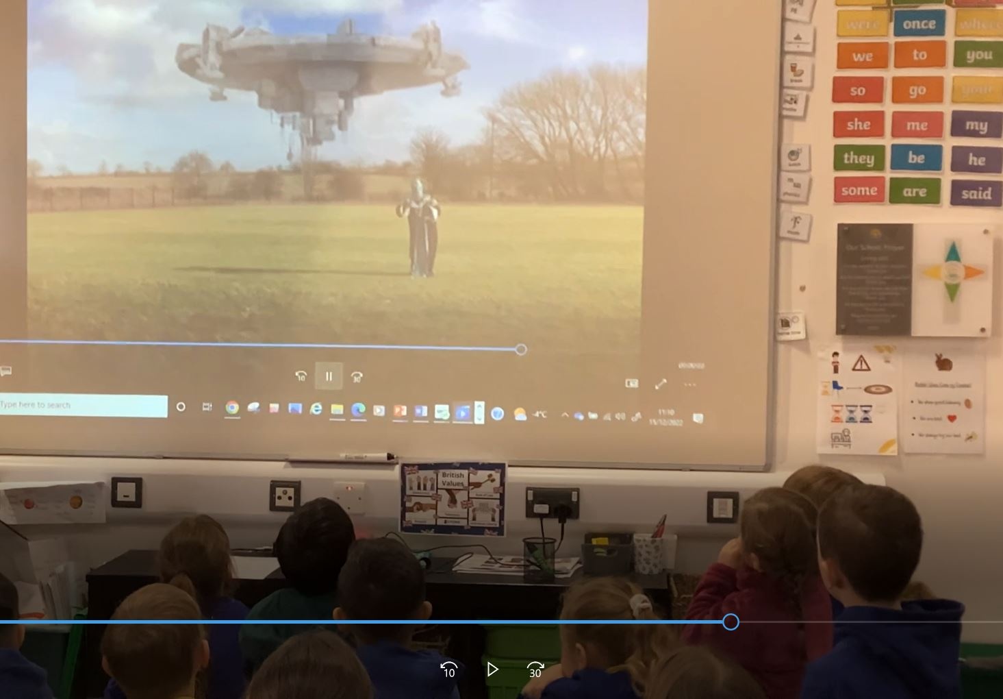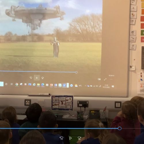 The children discussed the colour of the alien and their markings. Then Mrs Williams showed us a clip from the Forest School cameras which showed a spaceship collecting the alien parent and baby to take them home to their planet.