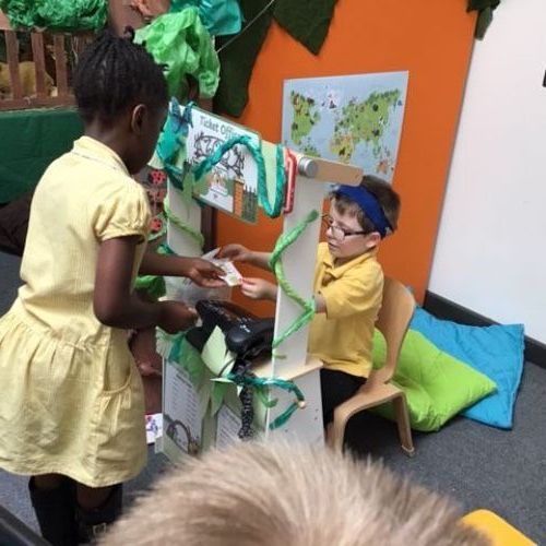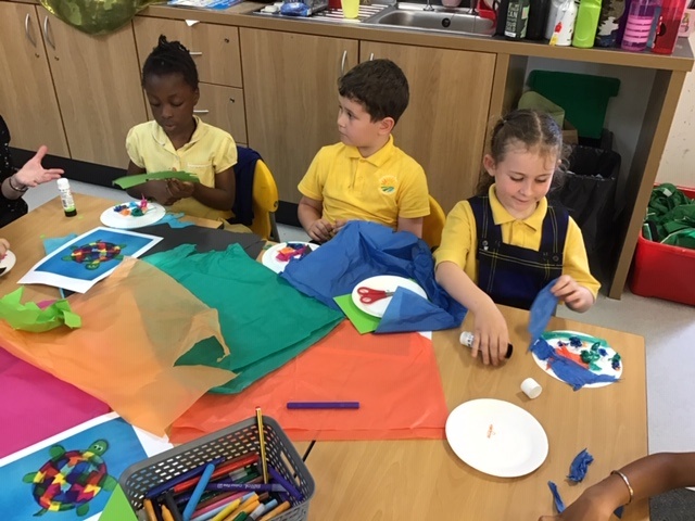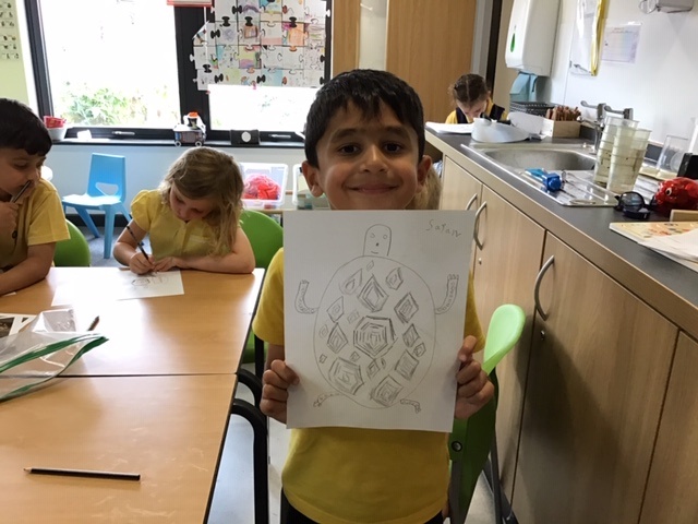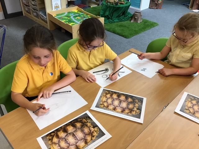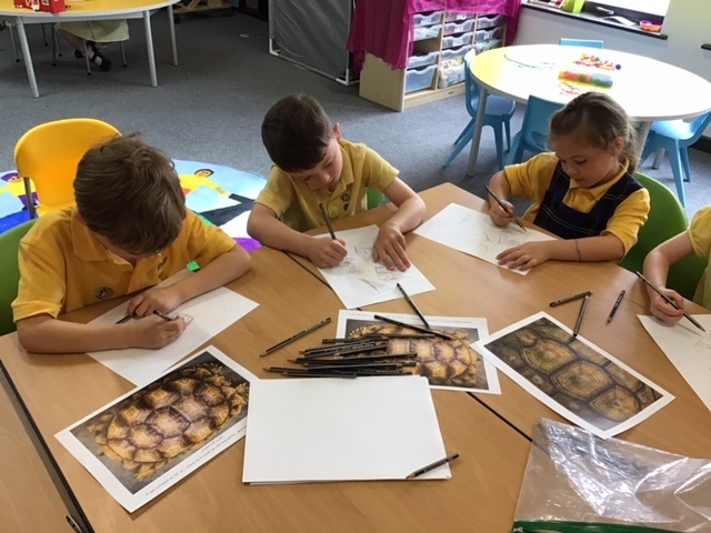 Year 1 have been carrying out art work based on the tortoise. We looked in detail at the shell and used sketching techniques to recreate the patterns. Using a collage technique the children created their own colourful tortoises. We also had fun playing in our stunning zoo role play area created by the Year 1 team and painted by the very talented Miss Taylor!