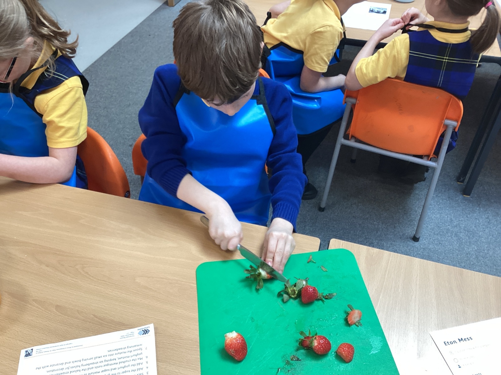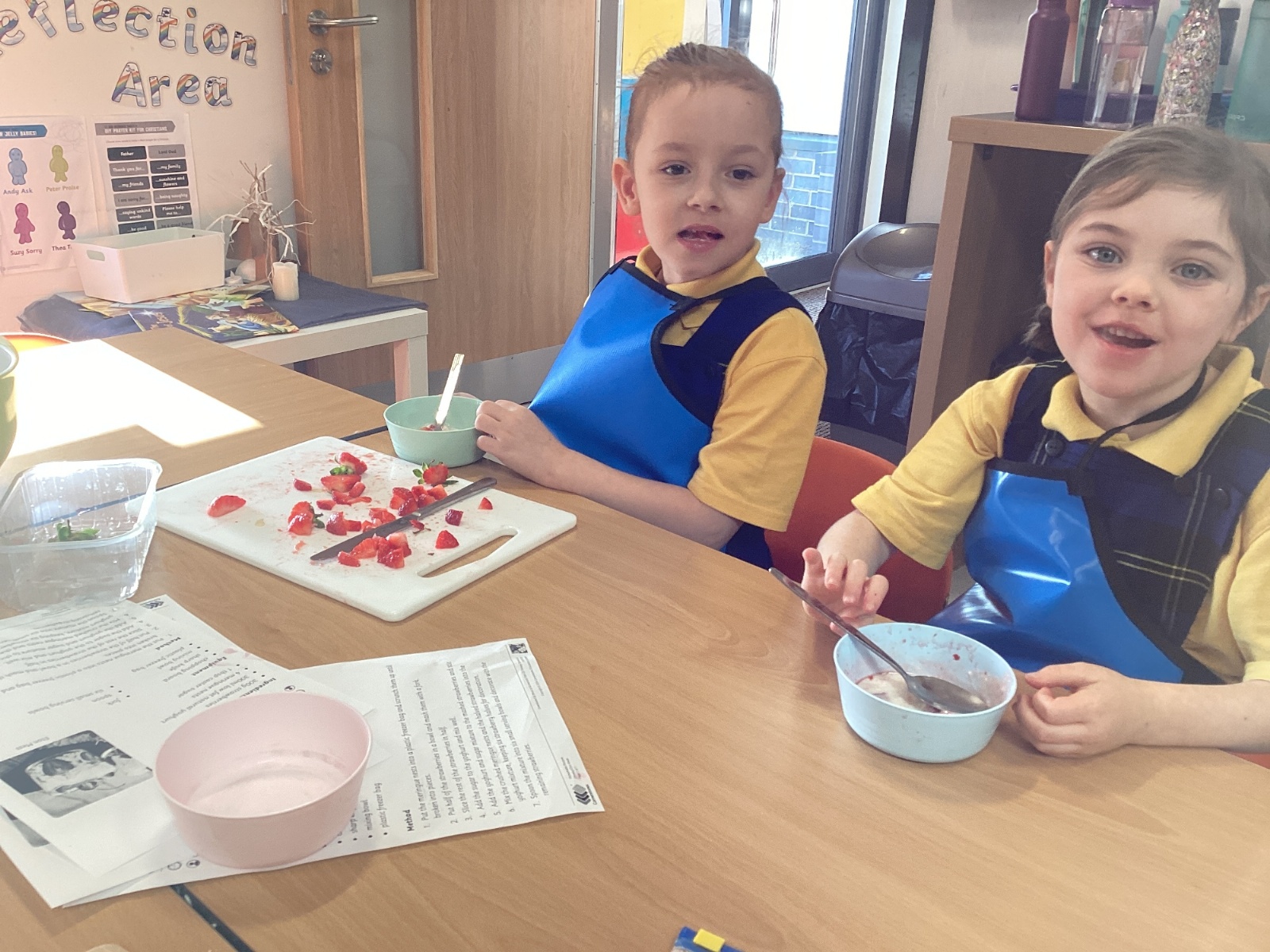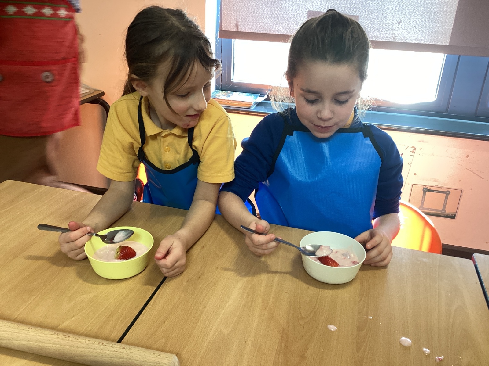 This week in our D&T unit "Remarkable Recipes" we learned how to read a recipe and follow hygiene rules such as washing hands and making sure our working area was clean and organised. We worked together to make a tasty Eton mess! Look at those strawberry smiles! Yum!
