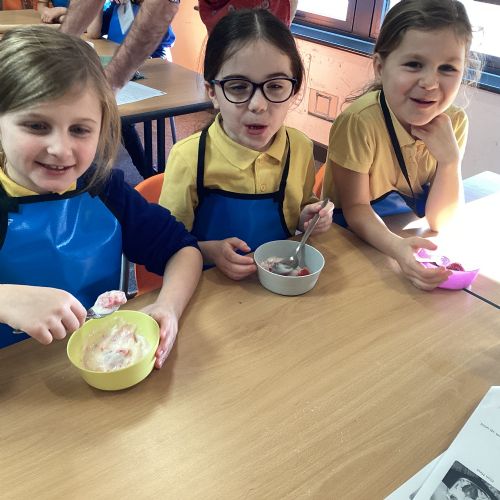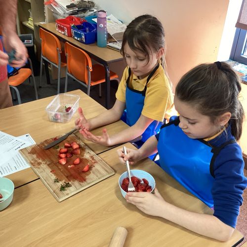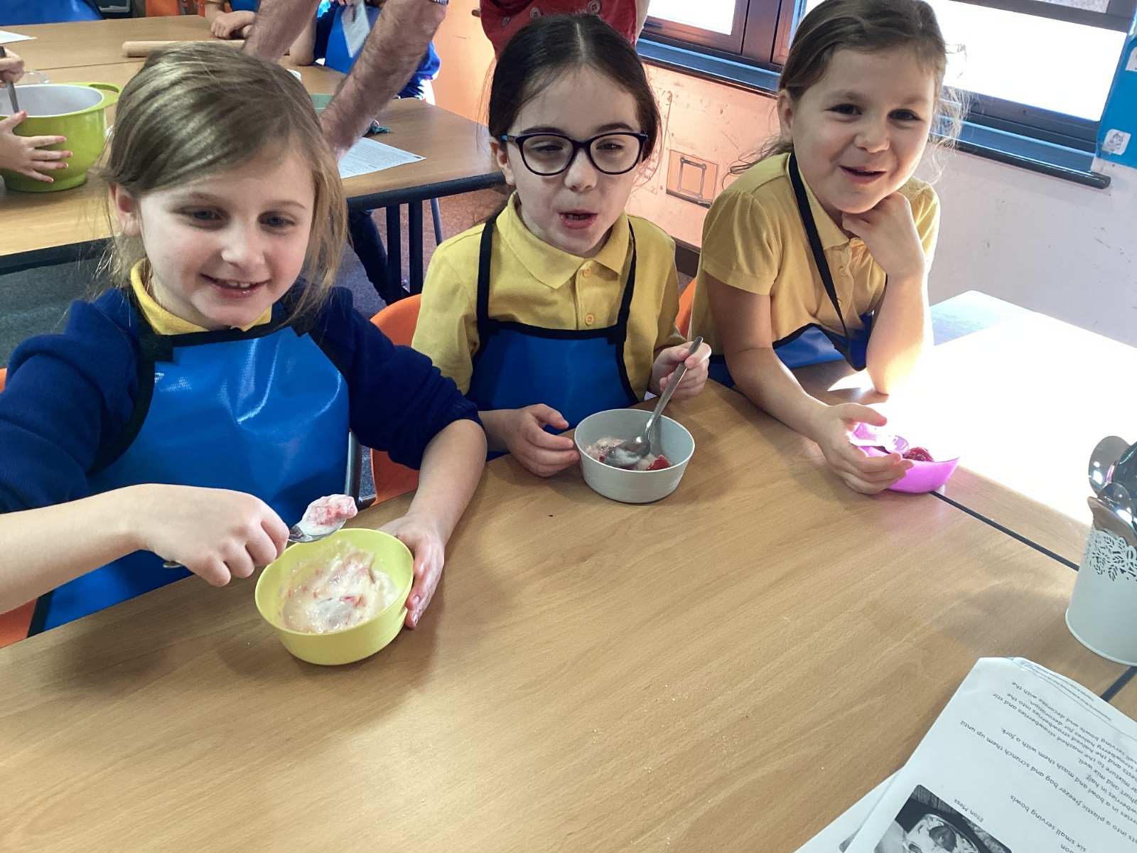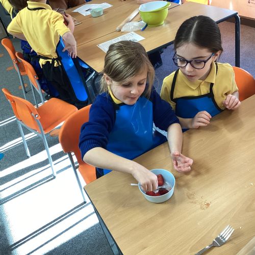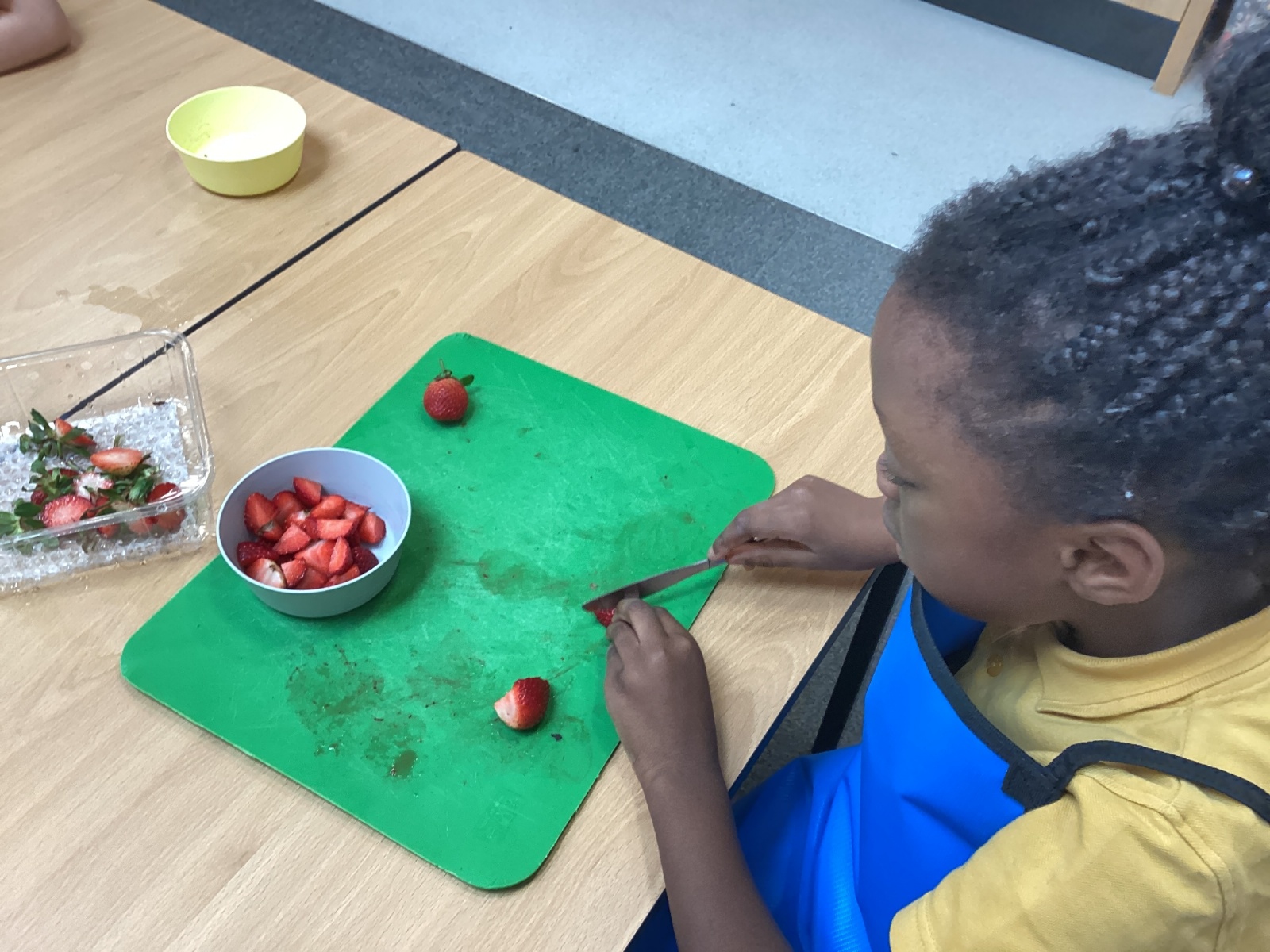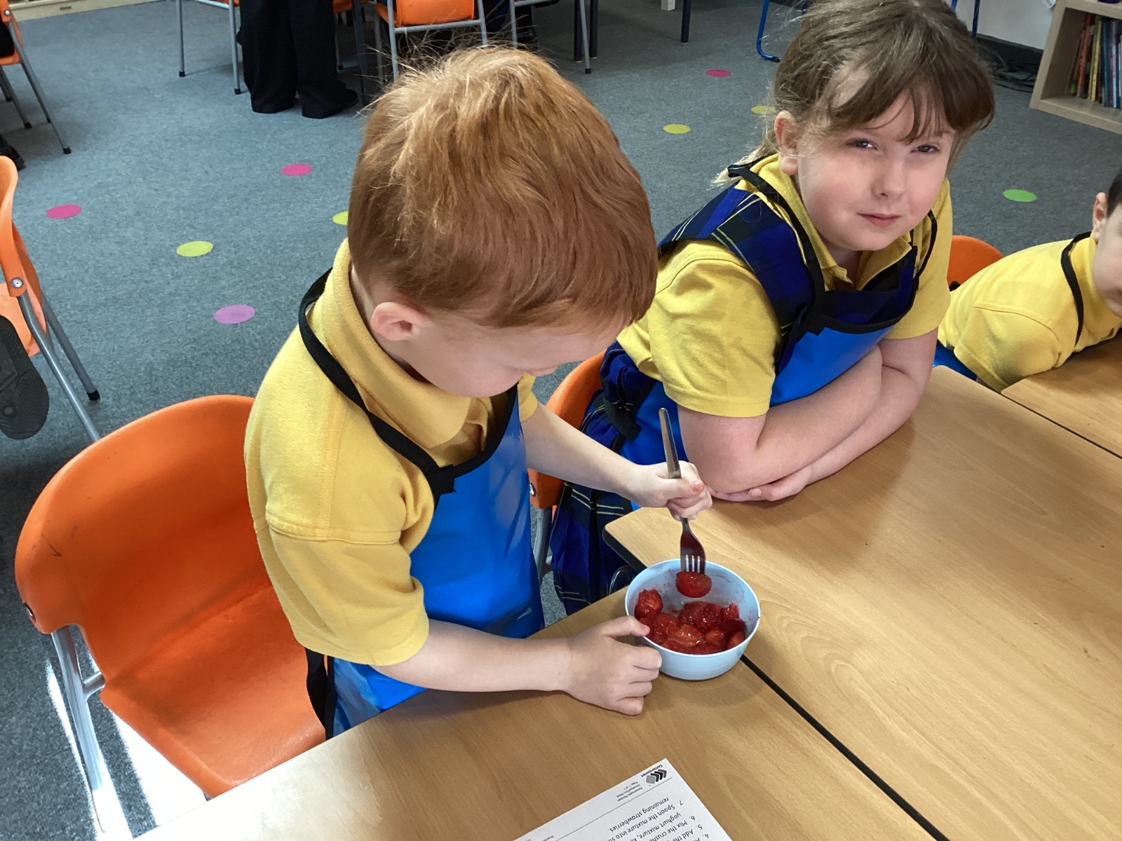 This week in our D&T unit "Remarkable Recipes" we learned how to read a recipe and follow hygiene rules such as washing hands and making sure our working area was clean and organised. We worked together to make a tasty Eton mess! Look at those strawberry smiles! Yum!