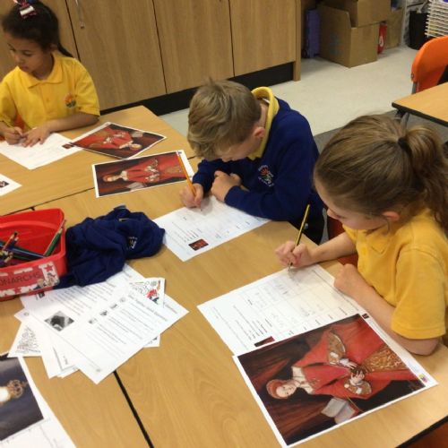 Year 2 have been looking at royal portraits this week.  We looked closely at the facial expressions, poses, clothing, objects and background.  We thought about the messages they were trying to send within the portraits.  The children really enjoyed observing the images closely.