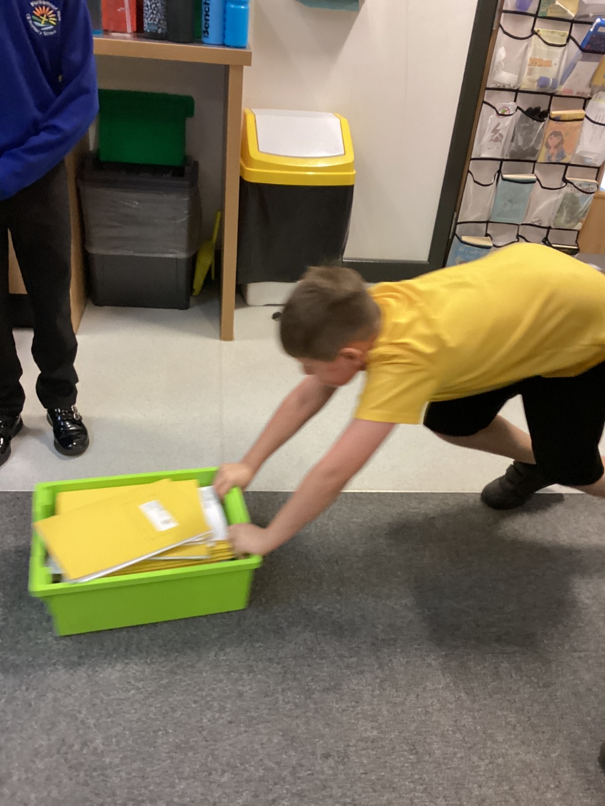 Next, we conducted a practical exploration of simple machine in the classroom. We pushed a heavy box of books along different surfaces and the children recalled that rough surfaces create friction, which makes the load harder to move. Then we put the box of books into a box with wheels and experienced how much easier it was to move. We combined the box on wheels with an inclined plane to explore how we could raise a heavy load to a higher level with less effort.