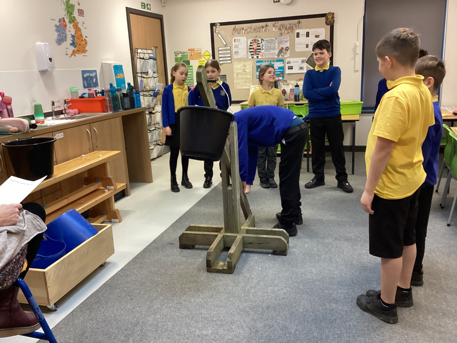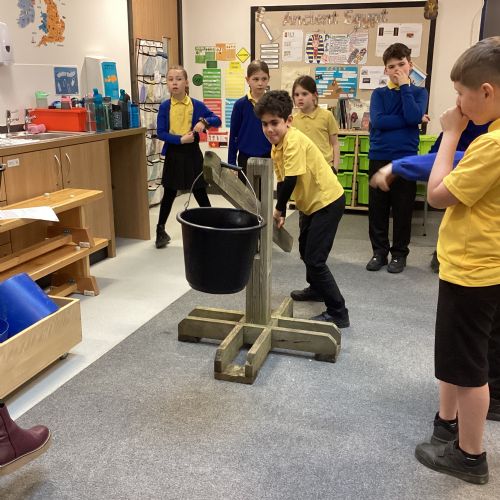 After that we explored using a lever to lift a bucket of rocks. The children agreed that the further from the fulcrum, we applied the force, the easier it was to lift the rocks. We also tried lifting the rocks with a pulley. We related this learning to Year 4's new topic of Ancient Egypt; considering how the tombs and other structures that the ancient Egyptians constructed out of heavy stone would have been constructed with these simple machines.