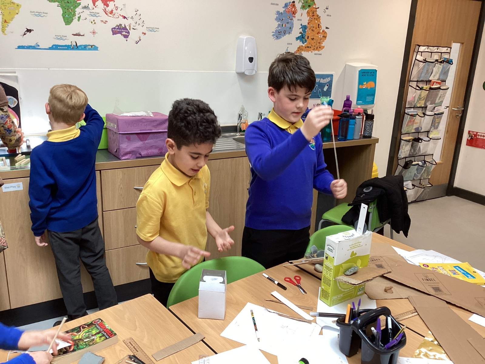 In design and technology, Year 4 have been finishing last term’s unit on simple machines. This is a companion project to their work on Ancient Egypt. The children have been wondering how the Ancient Egyptians managed to build their enormous pyramids and tombs using only simple machines. Recently their innovate project was to design and make a prototype of a machine that would have been useful to the Ancient Egyptian tomb builders.